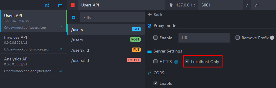 A new option is available that allows your mocks API to listen to localhost (and 127.0.0.1) only, instead of all network adapters (0.0.0.0). This feature can be easily enabled for each environment in the settings: