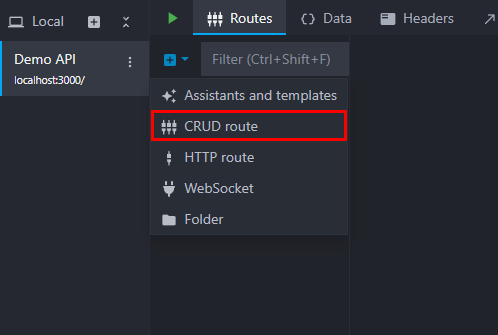 To create a CRUD route, click on the "CRUD route" entry in the add route menu:
