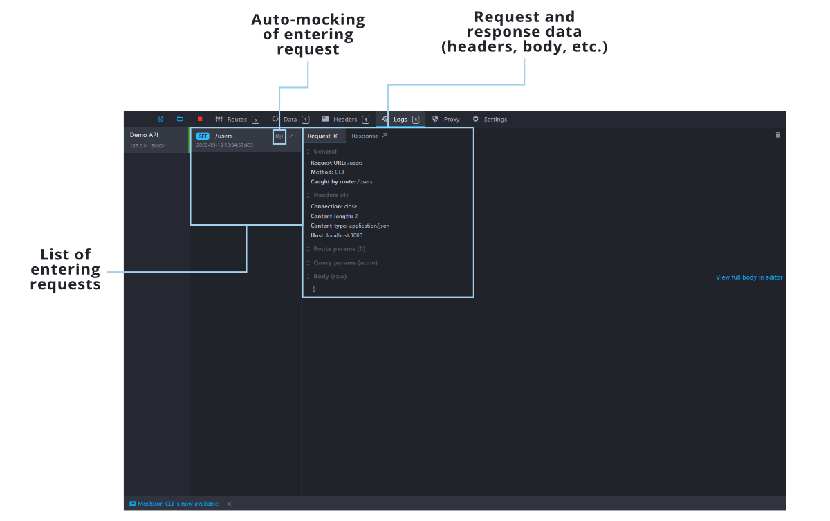 The request logging view is especially useful to debug the entering calls and how Mockoon responded to them. For each, you will find the usual information: path, headers, body, etc. You can also see if the call has been caught or forwarded through the proxy (if enabled) and automatically mock entering requests that were not caught. Each environment (or mock API) has its own entering requests recording.