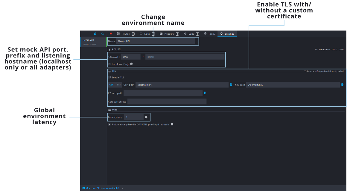 This view is the place where you can set up global settings for each environment. Changing the environment name, port, or API prefix, enabling HTTPS and using a custom certificate, handling OPTIONS pre-flight requests automatically, etc.