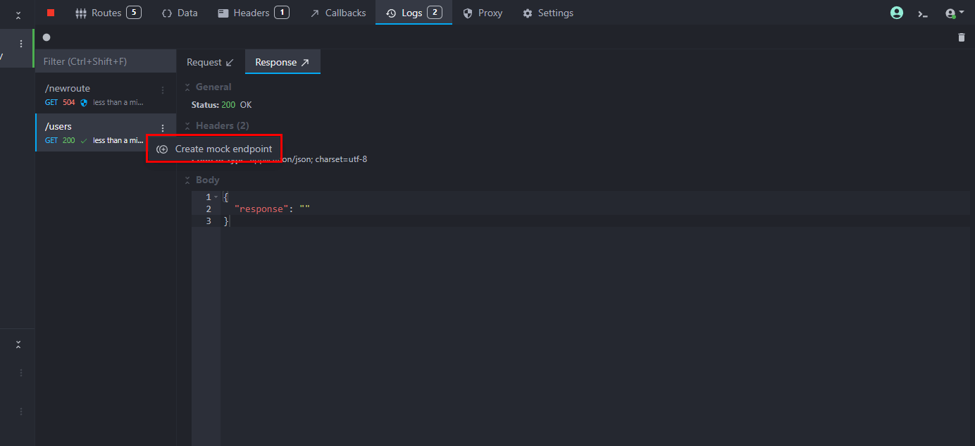 Mockoon offers the possibility to automatically create mocks for entering requests. Click on the "plus" icon on a record to create a route containing the same information (headers, body, etc.):