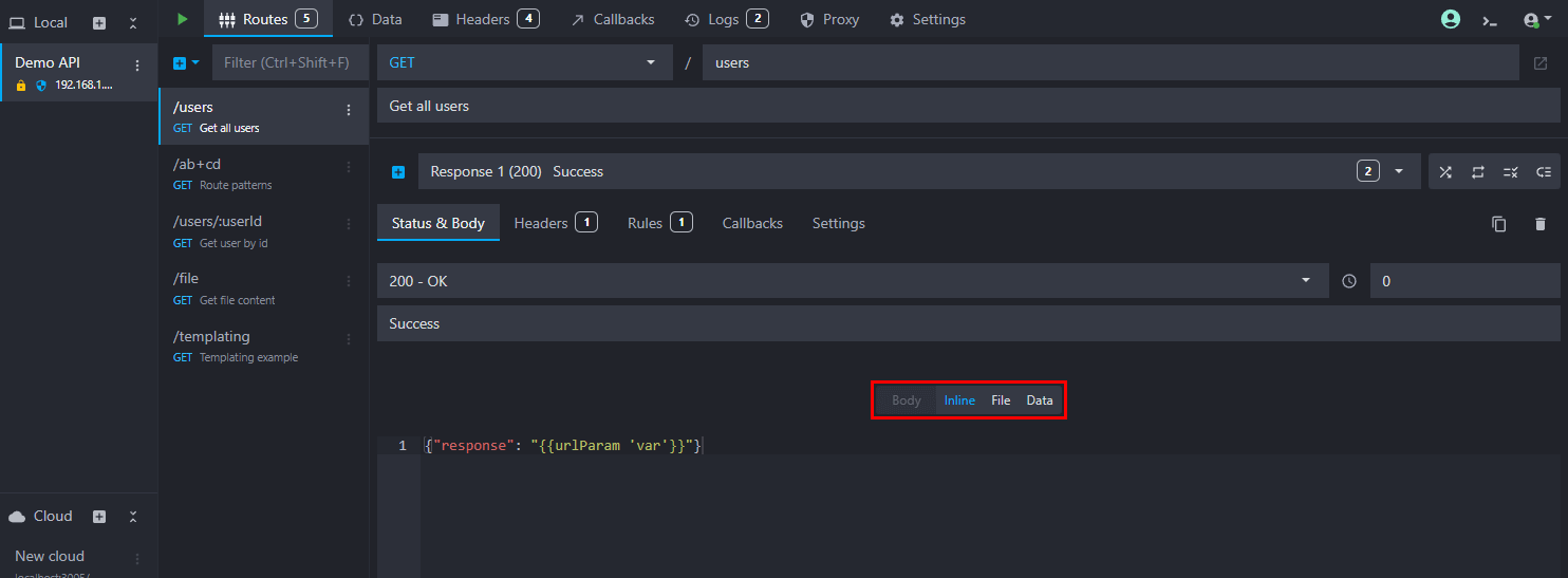 Each route response can serve a different body content. You have three possibilities to add a body content to your response: the inline body editor, an external file, or the content of a data bucket.