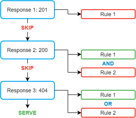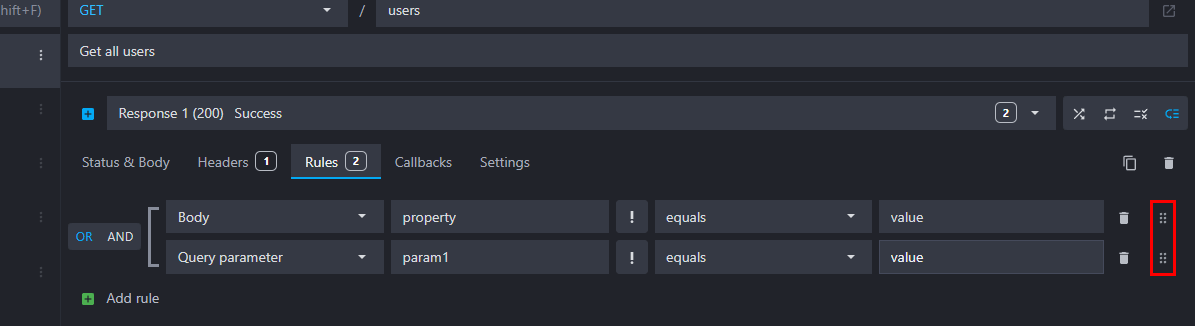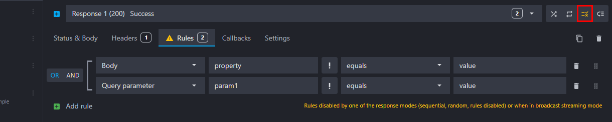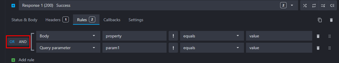 You can define an unlimited number of rules for each route. At each request, Mockoon will assert each response's rules and serve the response which contains the first matching rule(s). The rules are interpreted in the order they are declared: [rule OR|AND rule] OR [rule OR|AND rule], the brackets symbolizing each route response.