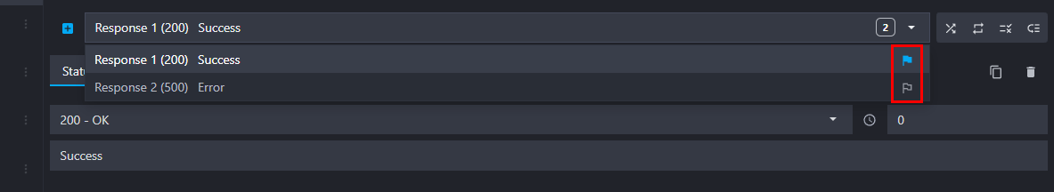 Without rules or when a request does not match the one you defined, the default response will always be the one marked with the blue flag. You can easily change the default response by clicking on the grey flags in the menu: