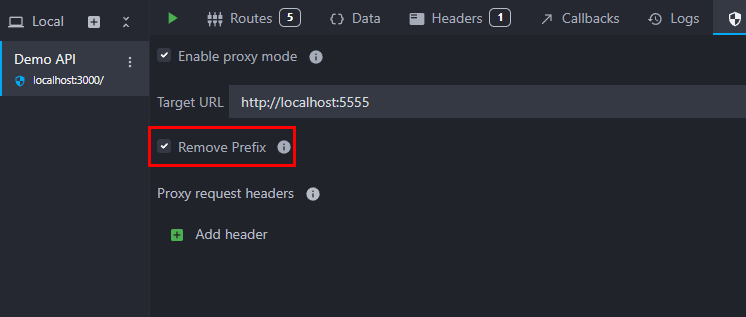By default, the API prefix will be part of the path called on the proxied API. You can disable this behavior by ticking the "Remove prefix" checkbox: