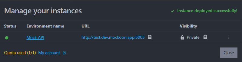 You can deploy your mock APIs directly from the desktop application, and set the instance visibility to public or private. Public instances are accessible to anyone with the URL, while private instances require an API key to access: