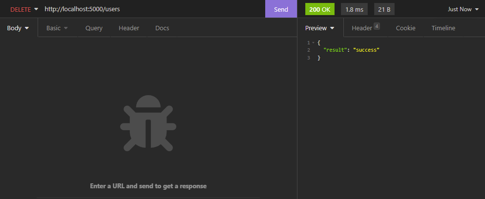 Your API is available on http://localhost:5000. You can do a test call to the following API endpoints GET /users and DELETE /users using your favorite tool (here, Insomnia) and see the returned response: