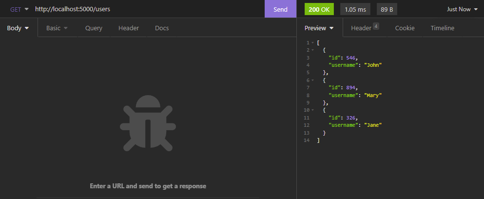 Copyfrom flask import Flask, jsonify app = Flask(__name__); @app.route('/users', methods=['GET']) def get_users(): return jsonify([ {'id': 546, 'username': 'John'}, {'id': 894, 'username': 'Mary'}, {'id': 326, 'username': 'Jane'} ]) @app.route('/users', methods=['DELETE']) def delete_user(): return jsonify({'result': 'success'})