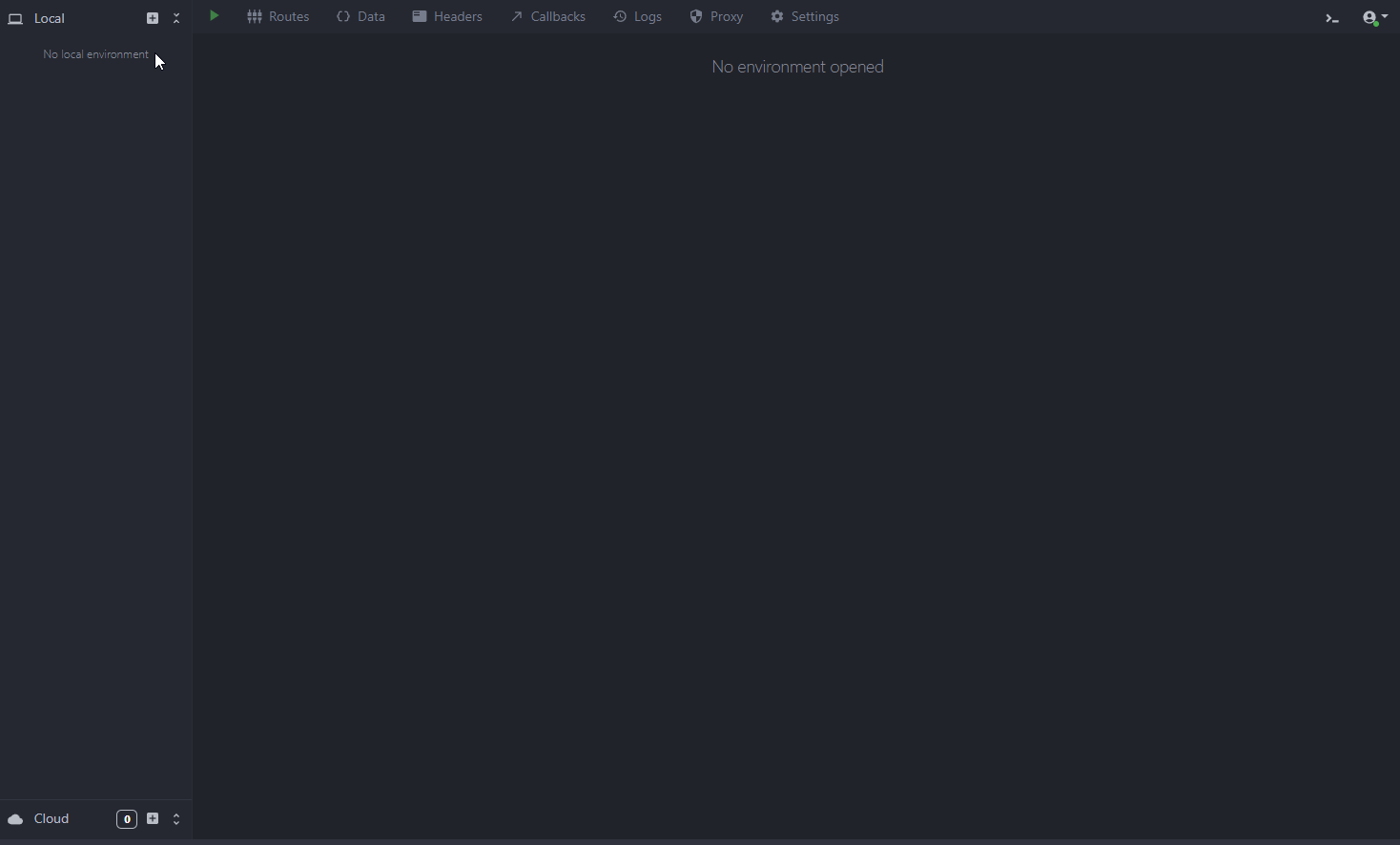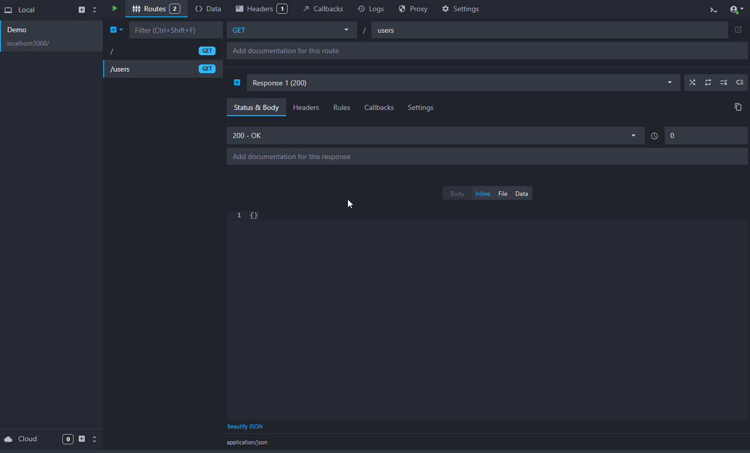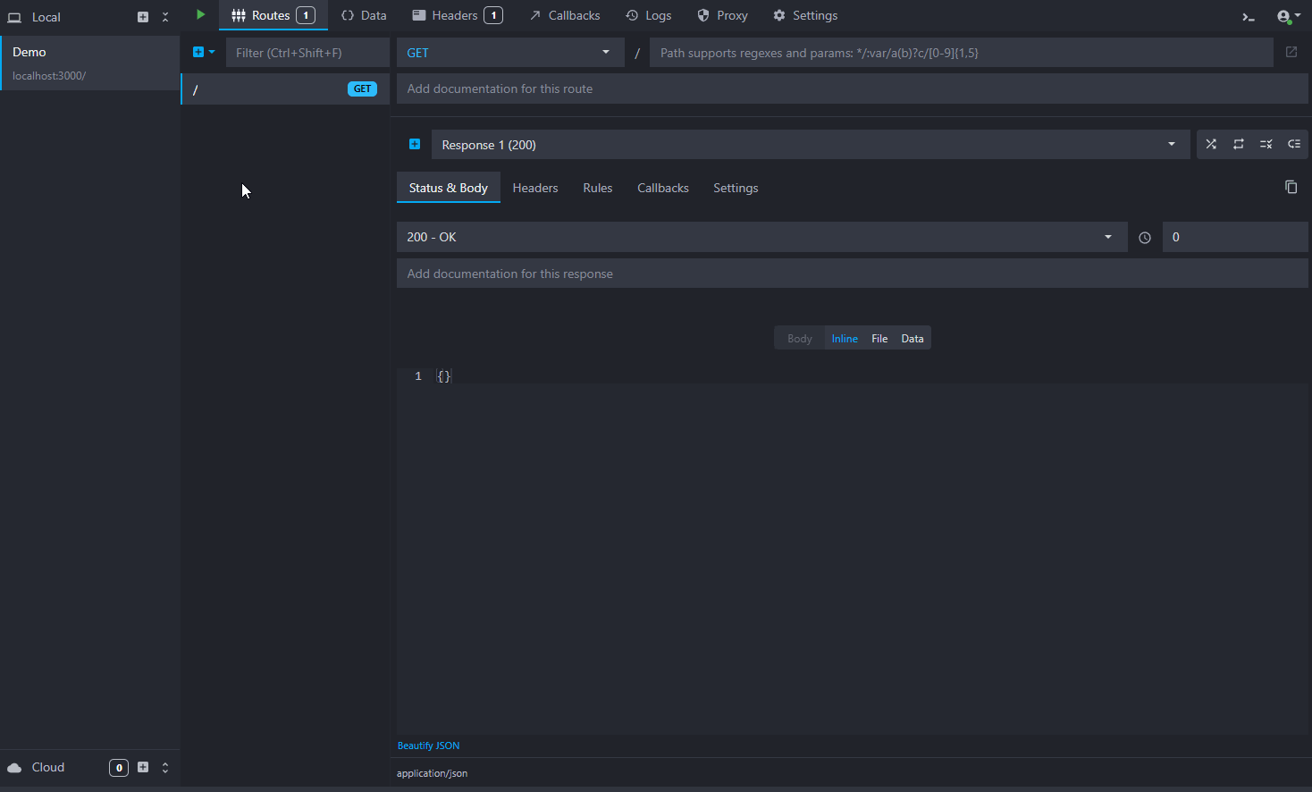 At the first launch, you will have a default setup, the demo API, also called an environment in Mockoon. This demo API showcases the main features of Mockoon and is a good starting point to understand how Mockoon works.