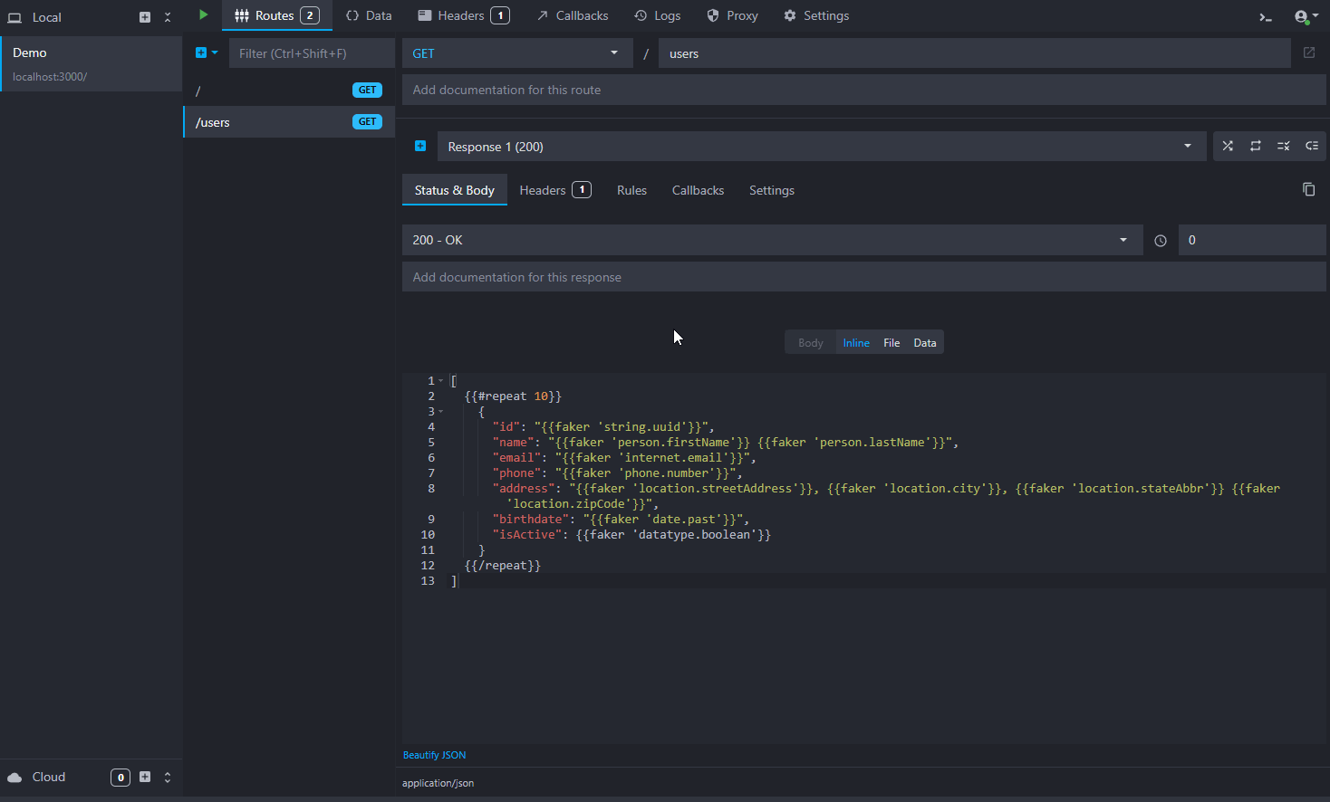Copy// Sample body [ {{#repeat 10}} { "id": "{{faker 'string.uuid'}}", "name": "{{faker 'person.firstName'}} {{faker 'person.lastName'}}", "email": "{{faker 'internet.email'}}", "phone": "{{faker 'phone.number'}}", "address": "{{faker 'location.streetAddress'}}, {{faker 'location.city'}}, {{faker 'location.state' abbreviated=true}} {{faker 'location.zipCode'}}", "birthdate": "{{faker 'date.past'}}", "isActive": {{faker 'datatype.boolean'}} } {{/repeat}} ]