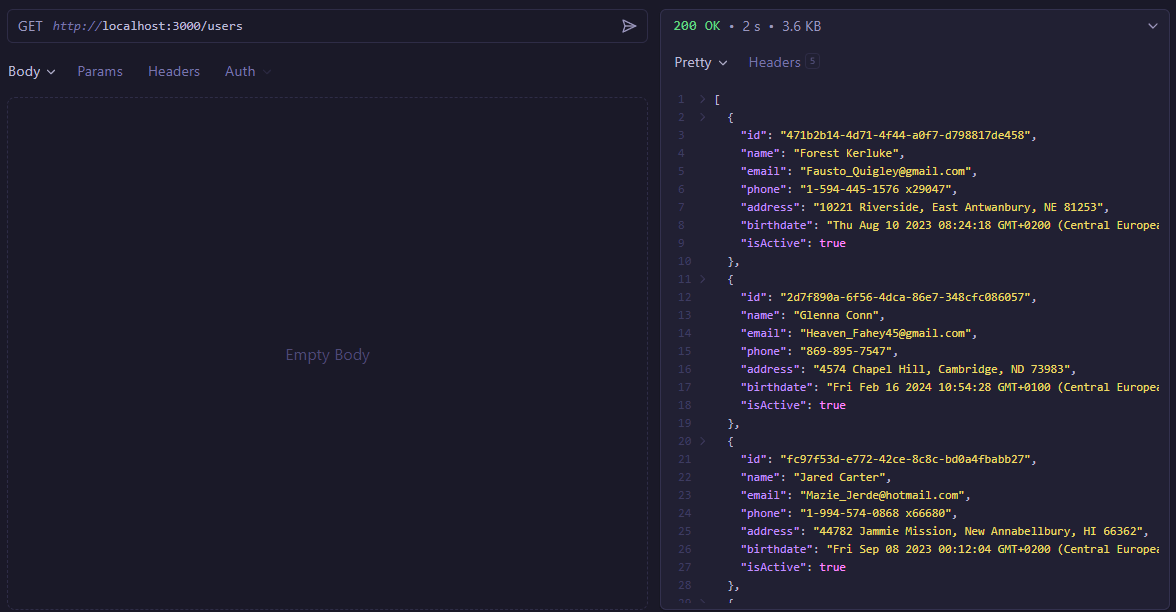 You can do a test call to the following URL http://localhost:3000/users using a tool like curl, Postman, or your browser. You should see the list of randomly generated users in the response: