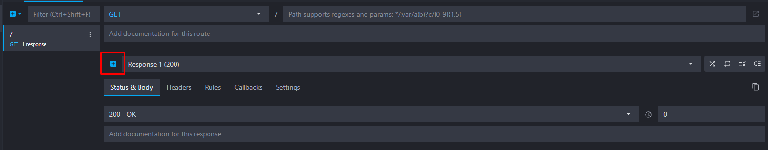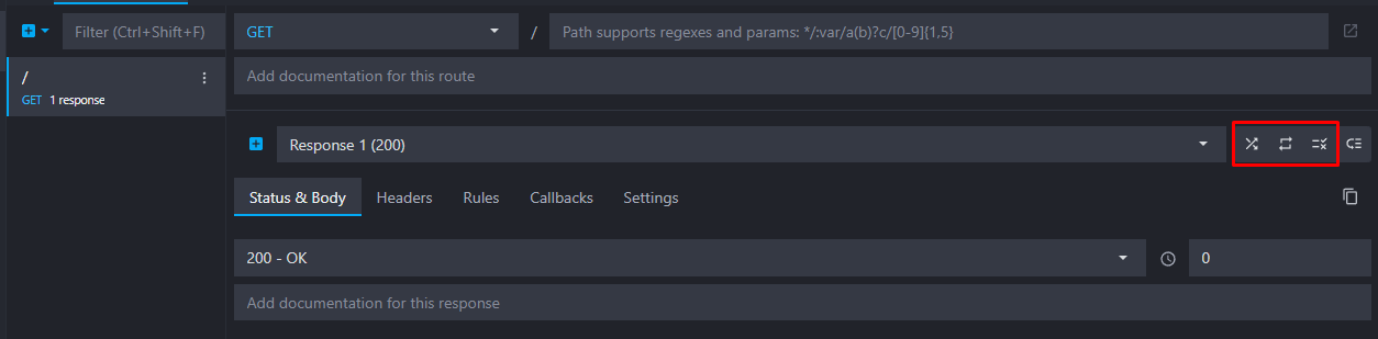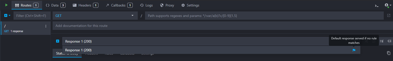 When you create a new HTTP endpoint, there is always at least one default response with a 200 status code. The default response is always marked with a blue flag and is served when no rule matches, when they are disabled, or simply when there are no other responses. We will keep the flag on this success response.