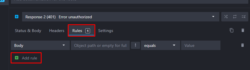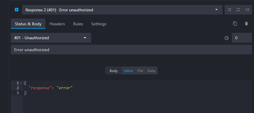 The next step is to add a second response returning a 401 status code when the "Authorization" header is missing from the request.