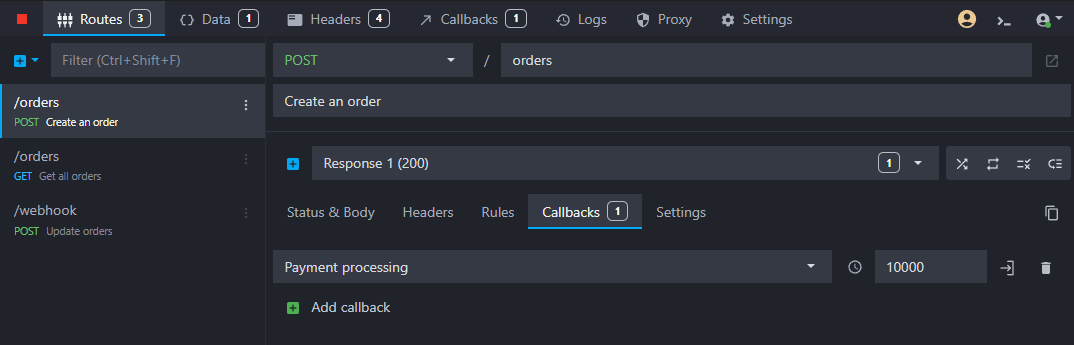 To simulate a payment processing happening after an order is created, we need to attach the callback to the order creation endpoint (POST /orders). To do so, go back to the "Routes" view, select the order creation endpoint, and click on the "Callbacks" tab in the response view. Select the "Payment processing" callback, and add a delay of 10 seconds:
