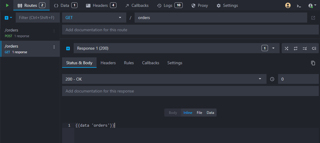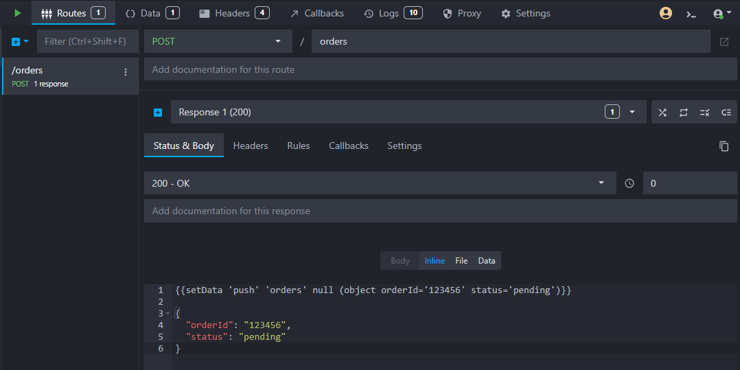 The next step is to create a new endpoint that will simulate an order creation in your application. This endpoint will store a new order in our data bucket and later trigger the callback. Let's create a new HTTP POST route with the path /orders and add a template to the response body to simulate the order creation in the data bucket and return the new order: