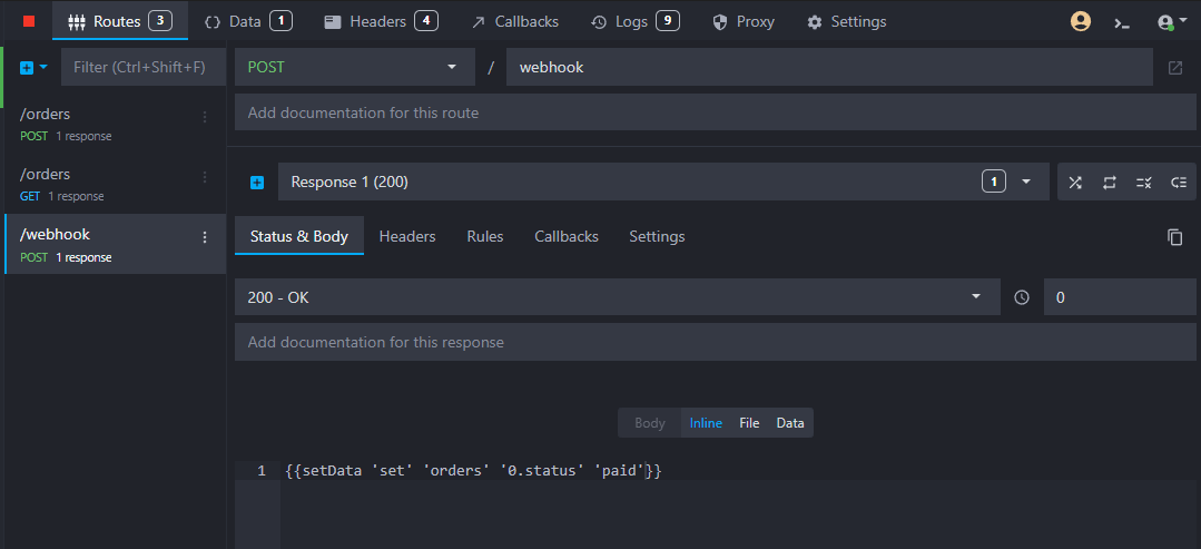 We now need to create a new endpoint that will receive the webhook from the simulated payment gateway. This endpoint will update our order status. Let's create a new HTTP POST route with the path /webhook and add a template to update the order status in the data bucket: