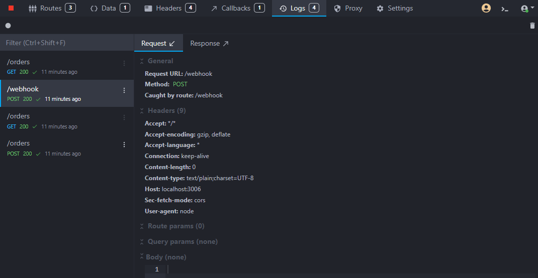Finally, you can check the request logs in the "Logs" view to see if the webhook was triggered: