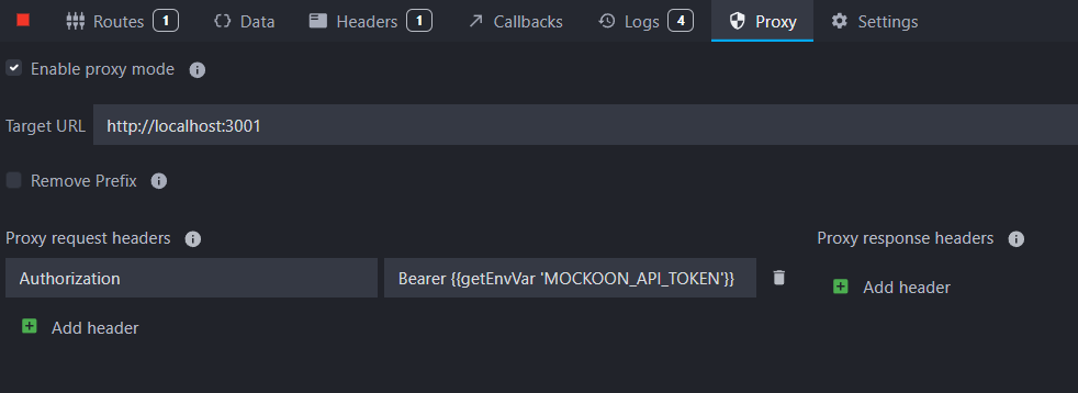 In your mock server, we will enable the proxy mode, point to the correct API endpoint (here, the endpoint is a fictive one), and use the getEnvVar helper to access the token and add it to an Authorization header: