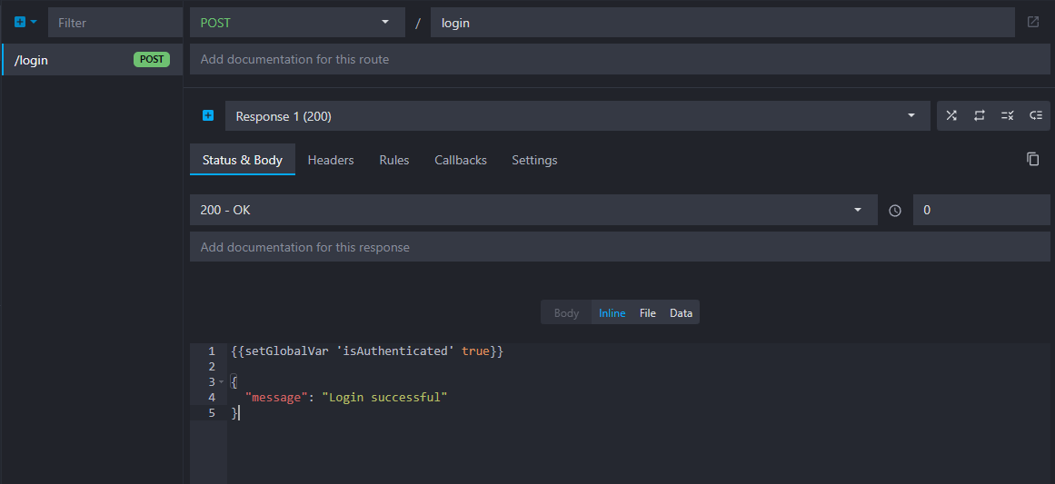 First, create a new route POST /login to simulate a user logging in. Set the route with the following settings: