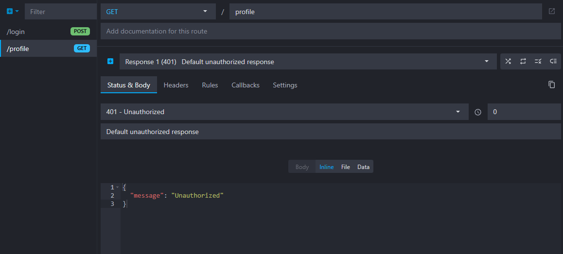 If you test the route now by making a GET call to /profile, you will always receive the 401 response because this is the default response, and there is no rule to check if the user is authenticated yet.