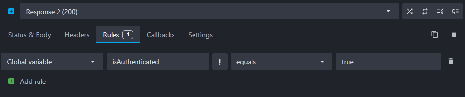 To enable the user to access the profile only if they are authenticated (i.e. the /login route was called, and the global variable isAuthenticated is true), we need to add a rule on the second response to check the value of the global variable isAuthenticated.