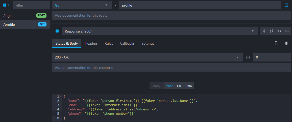 Then, create a new GET /profile route to simulate retrieving a user profile. For this route, we will check if the user is authenticated before returning the profile using two responses and a rule.